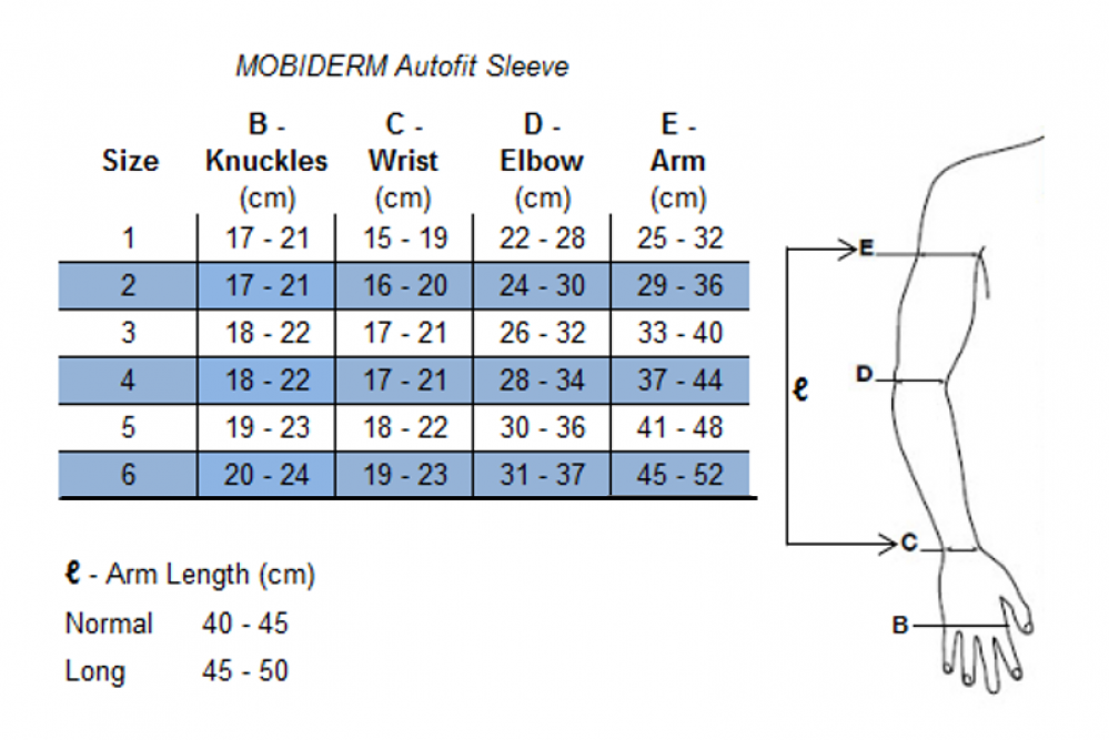 Mobiderm® Autofit Sleeve تم تصميمها لتقديم علاج لحالات الوذمة اللمفاوية في الذراع اليمنى. تساعد في تحريك الوذمة أثناء الليل وتعزيز آثار العلاج أثناء النهار.